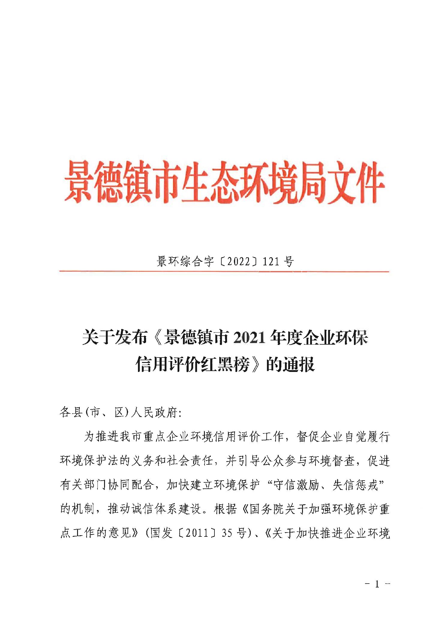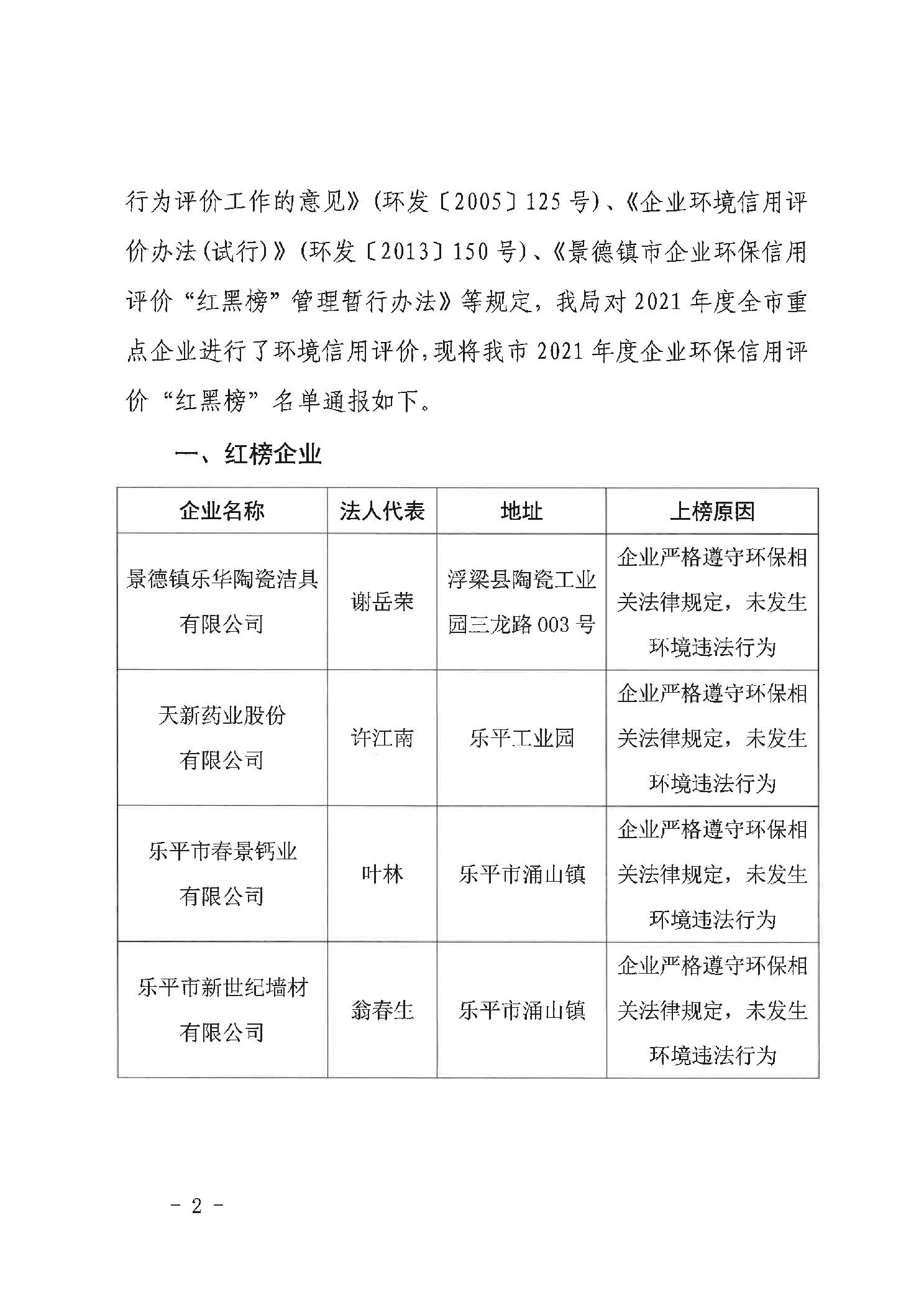 关于发布《景德镇市2021年度企业环保信用评价红黑榜》的通报