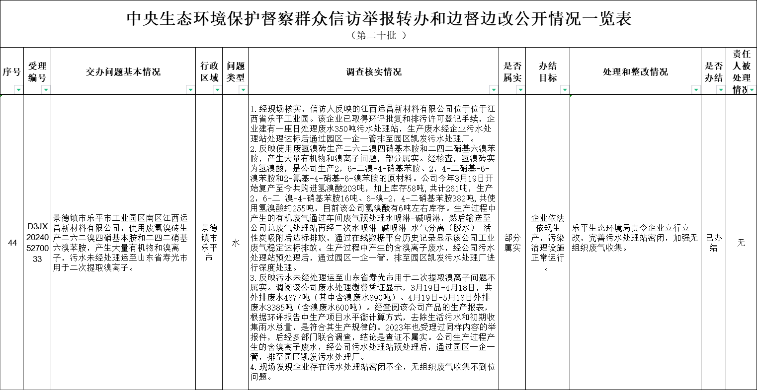 截至6月6日,对中央第三生态环境保护督察组向景德镇市移交的第二十批群众信访举报件1件,各责任单位均按要求上报调查处理情况。根据督察要求,群众信访举报转办和边督边改公开情况一览表将在报纸、网站等媒体上公布。