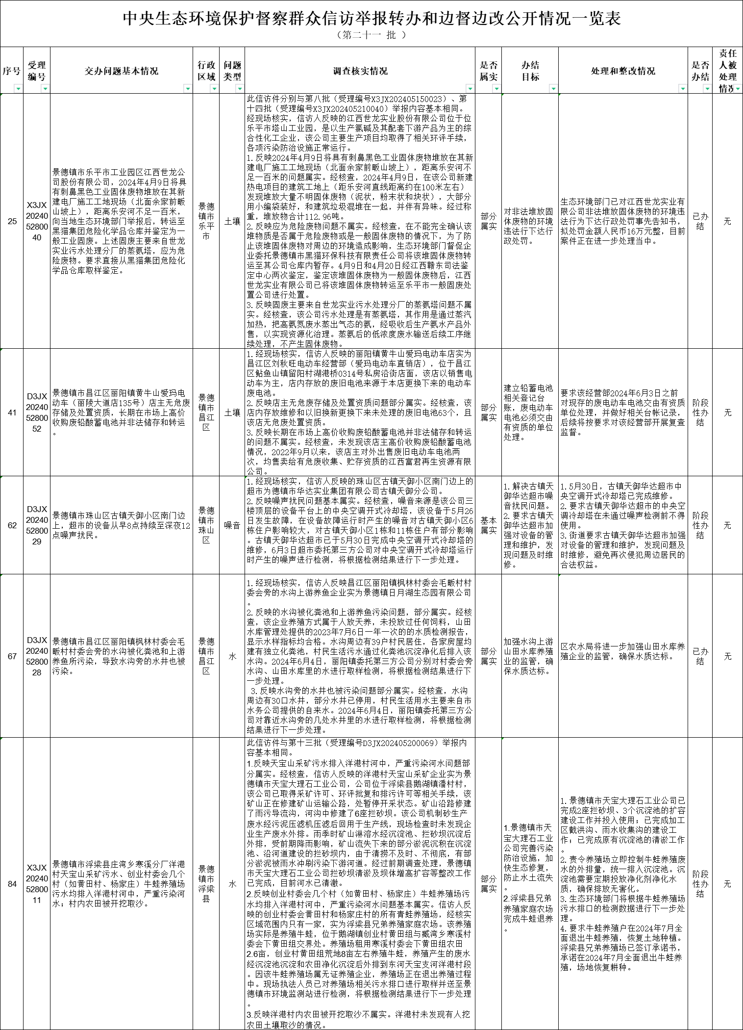 截至6月7日,对中央第三生态环境保护督察组向景德镇市移交的第二十一批群众信访举报件5件,各责任单位均按要求上报调查处理情况。根据督察要求,群众信访举报转办和边督边改公开情况一览表将在报纸、网站等媒体上公布。