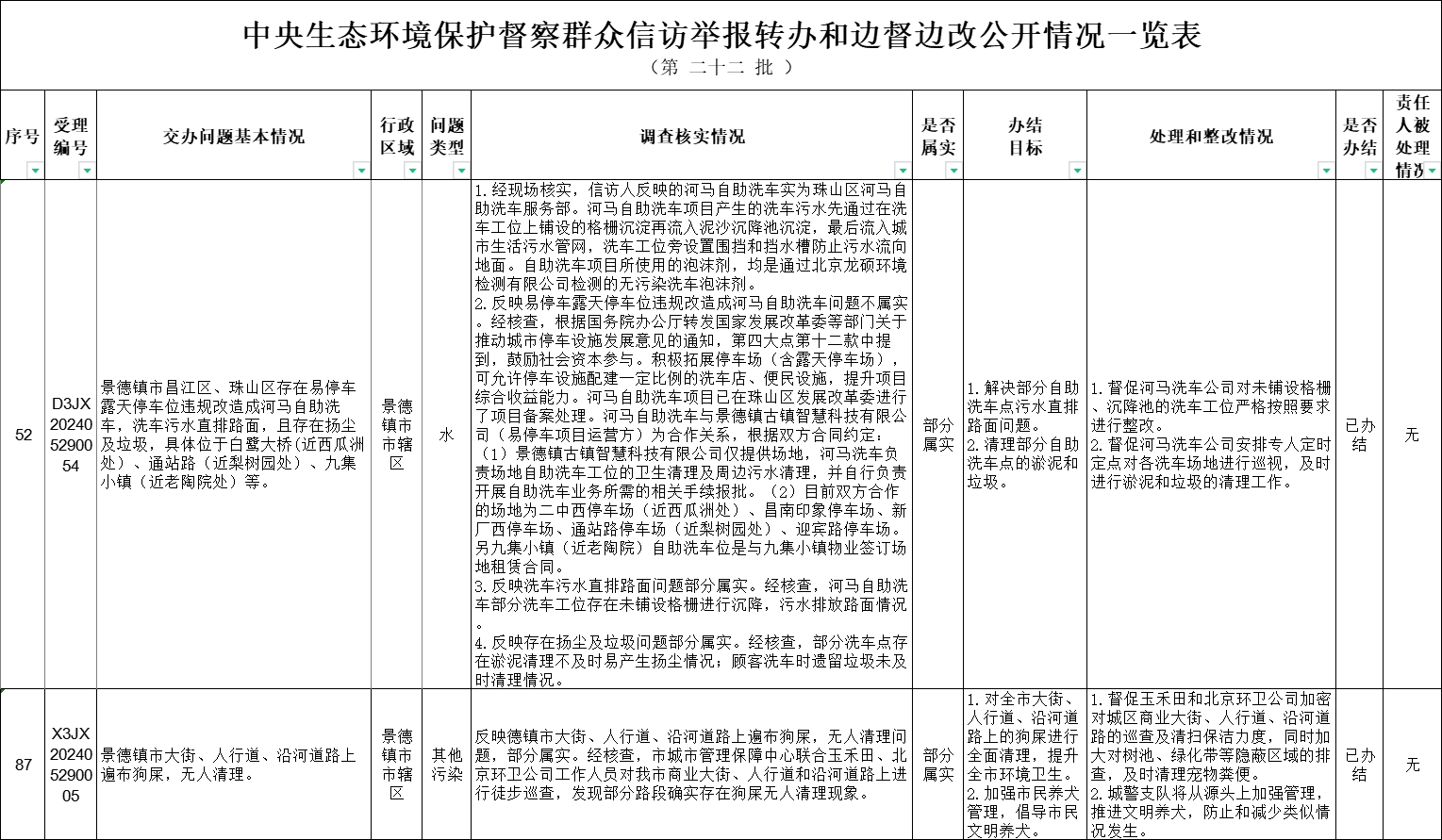 截至6月8日,对中央第三生态环境保护督察组向景德镇市移交的第二十二批群众信访举报件2件,各责任单位均按要求上报调查处理情况。根据督察要求,群众信访举报转办和边督边改公开情况一览表将在报纸、网站等媒体上公布。