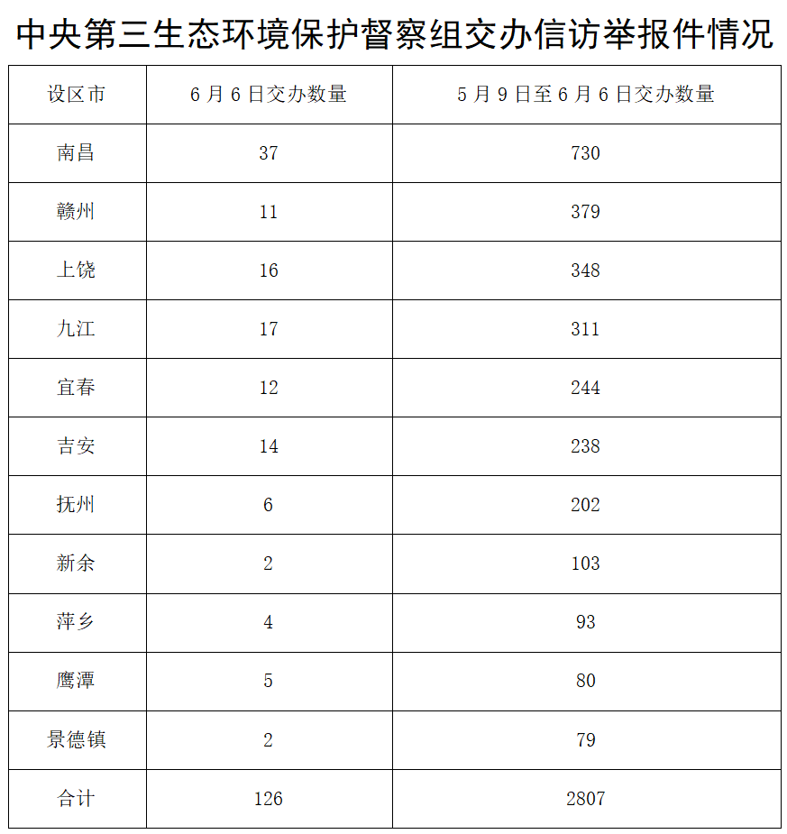 6月6日,中央第三生态环境保护督察组向江西移交第二十九批群众信访举报件126件(来电举报77件,来信举报49件),其中重点关注11件。