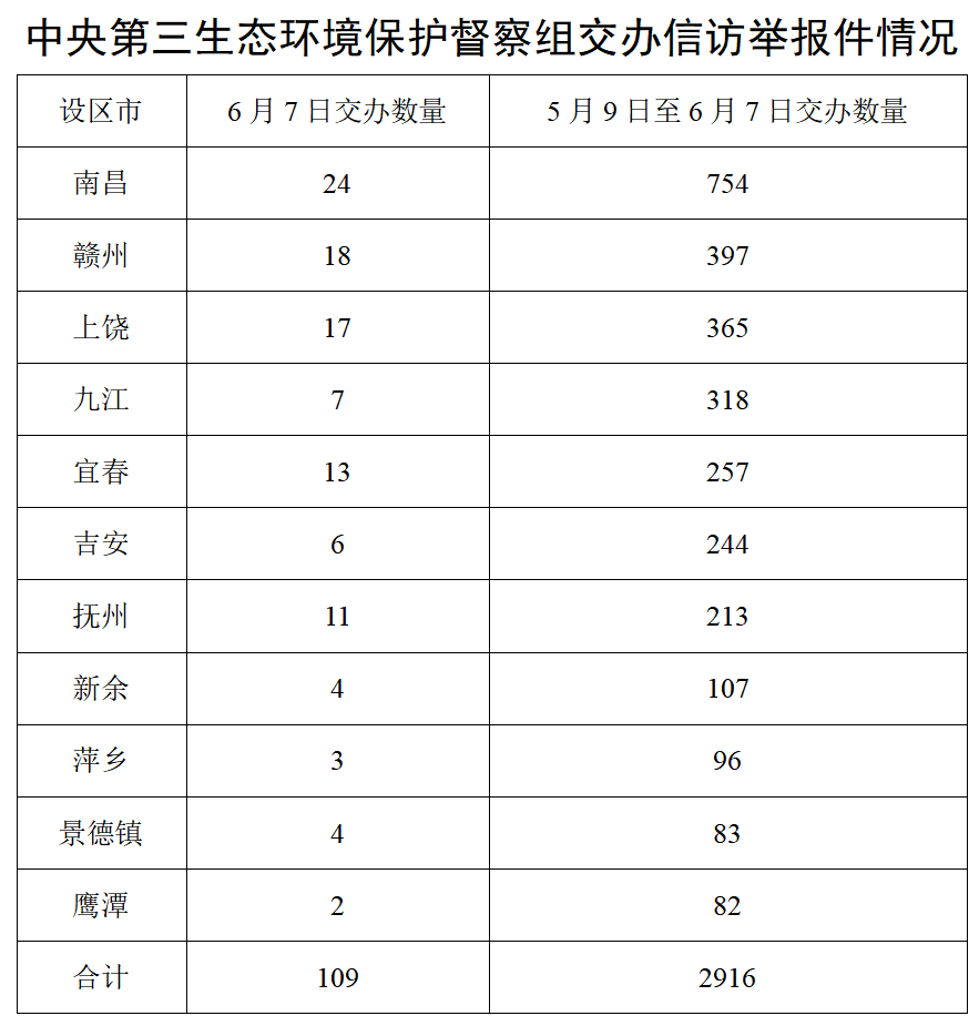 6月7日,中央第三生态环境保护督察组向江西移交第三十批群众信访举报件109件(来电举报73件,来信举报36件),其中重点关注12件。