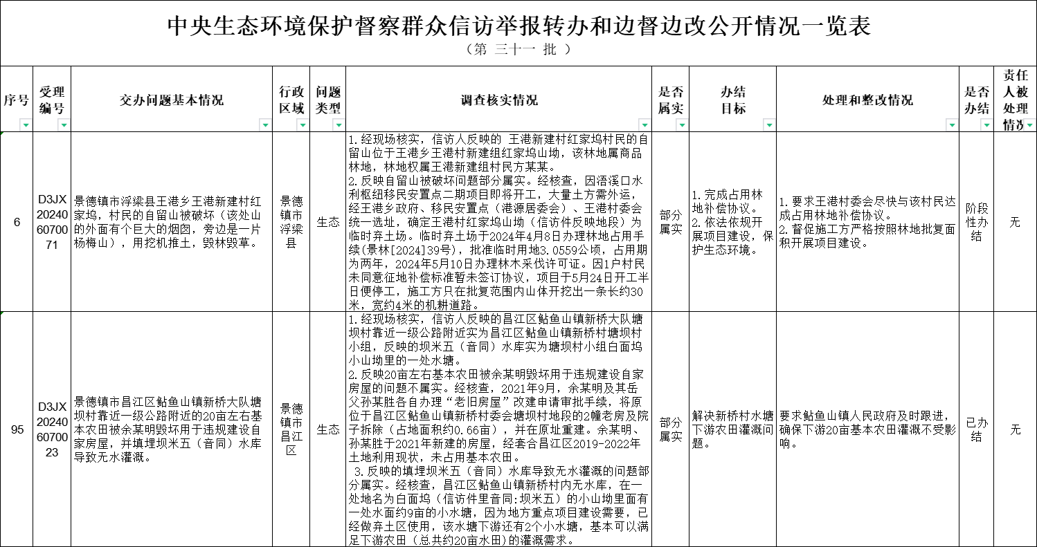 截至6月17日,对中央第三生态环境保护督察组向景德镇市移交的第三十一批群众信访举报件2件,各责任单位均按要求上报调查处理情况。根据督察要求,群众信访举报转办和边督边改公开情况一览表将在报纸、网站等媒体上公布。